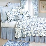 | Decorate your master suite, guest room, country cottage or beach house with this delicate floral monotone design that was inspired by an 18th century quilted copperplate-printed fabric. The Brighton Blue Toile quilt set has a beautiful intricate and detailed stitching with scalloped edges on four sides. The reverse side of the quilt is a coordinating ticking stripe print which is also on the bed skirt. The Brighton Toile Quilt set is also available in black, red and green. The quilt is prewashed and should be machine washed on gentle and then line dried. ...Read