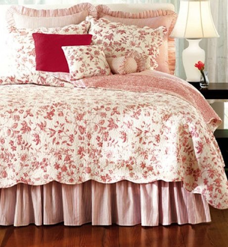 Decorate your master suite, guest room, country cottage or beach house with this delicate floral monotone design that was inspired by an 18th century quilted copperplate-printed fabric. The Brighton Red Toile quilt set has a beautiful intricate and detailed stitching with scalloped edges on four sides. The reverse side of the quilt is a coordinating ticking stripe print which is also on the bed skirt. The Brighton Toile Quilt set is also available in black, blue and green. The quilt is prewashed and should be machine washed on gentle and then line dried. READ MORE... |