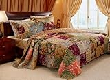 | French Country Floral Cotton King Size Quilt 3pc Set - Add warmth and elegance to your bedroom with this gorgeous French Country patchwork quilt set. Stunning quality bedding with rich tones of floral and paisley prints. This cotton Quilt set features a Patchwork design with charming floral prints and paisleys pattern in rich tones of warm and deep Red, Coral, Moss and Sage Green, Golden Tan and Navy Blue. It is completely Reversible to a matching Sage, Gold and Rose floral. Finely stitched and beautifully detailed with Vermicelli quilting to add texture and for durability. It is made from 100% pre-washed cotton and cotton fill for softness and comfort. Face and back 100% pre-washed Cotton Fill: 100% Cotton Pattern: Floral and Paisley prints. Reversible to a matching Floral pattern Easy care. Machine wash cold. Tumble dry KING SIZE:?1 King size quilt 105" x 95"?2 King size Pillow Shams 20" x 36"***Bedspread (drop to the floor) in the same pattern also available ...Read